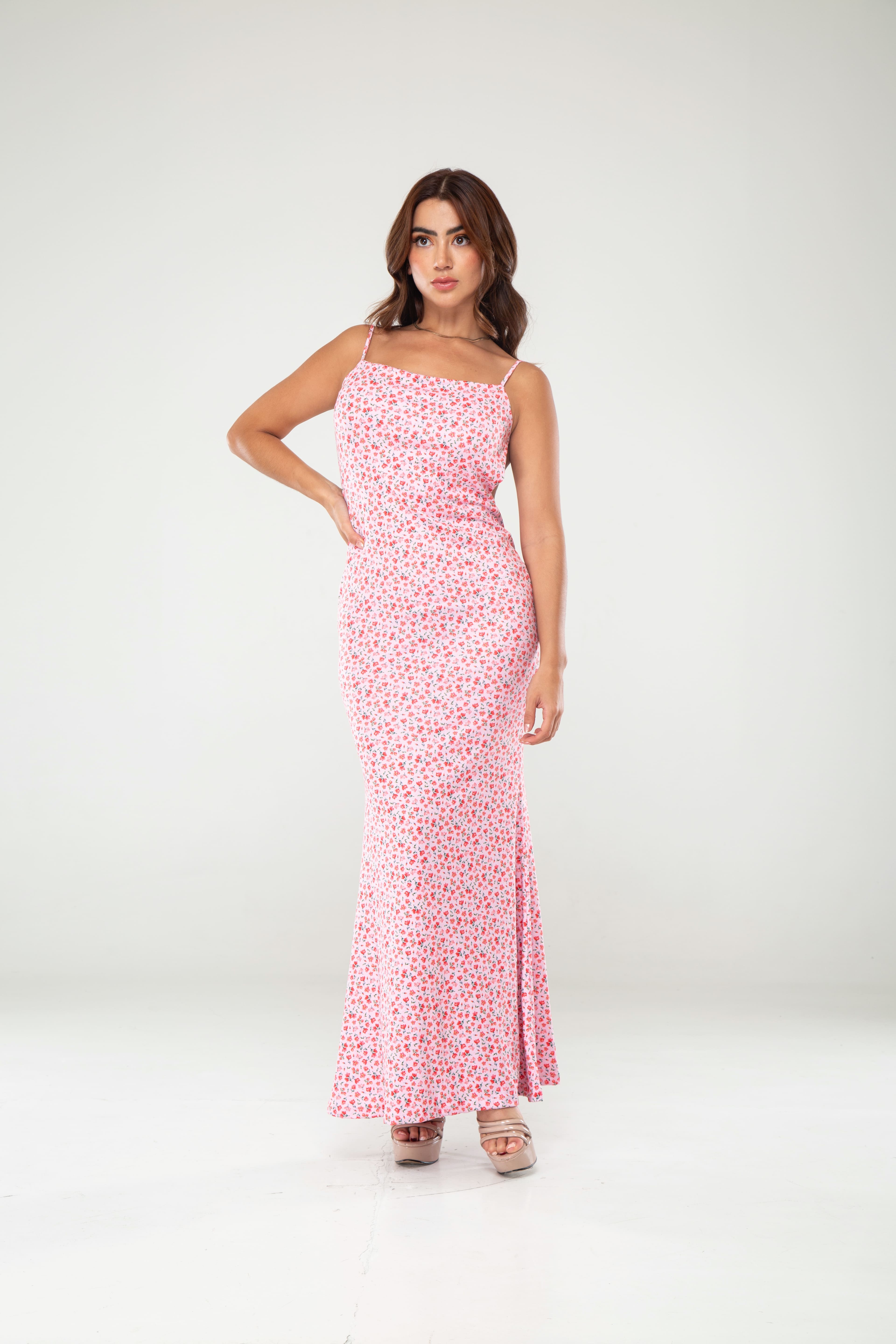 Vestido ceñido en tela piel durazno estampada, suave y fresca. Con tirantes delgados, espalda descubierta y estampado floral en tonos azules que aporta un look romántico y elegante. Ideal para lucir delicada y estilizada.